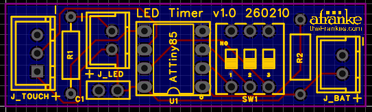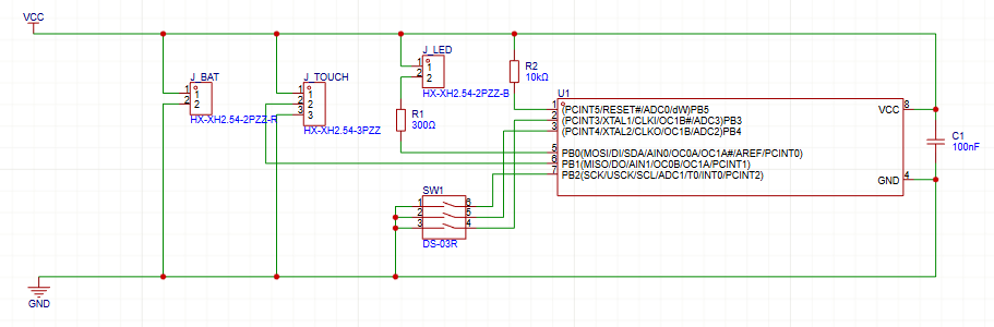 The core of the design is the ATtiny85, which handles It handles touch input, DIP switch configuration, LED control, and auto-off timing. Around it, the circuit is intentionally sparse: